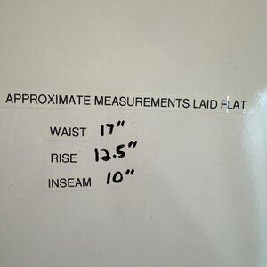 Waist laid flat = 17", Rise = 12.5", Inseam = 10"