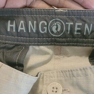 Men's tan/khaki hybrid hiking athletic shorts by Hang Ten, waist size 34. Lightweight shorts have internal draw cords, front slant zipper pockets, one button and one zipper back pocket. Fabric: polyester, cotton and elastane.
