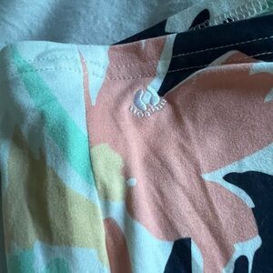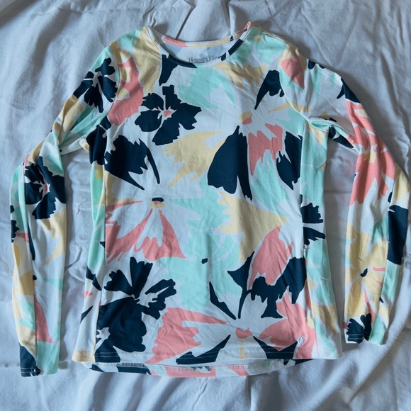 Long sleeve floral rash guard. Great for boating and other outdoor activities. Salmon pink, white, navy, and seafoam green over a white background. SPF.