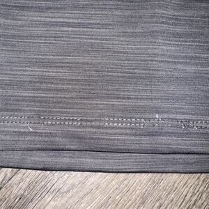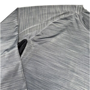 –Heathered gray with black contrast stretch panels at underarms and sides