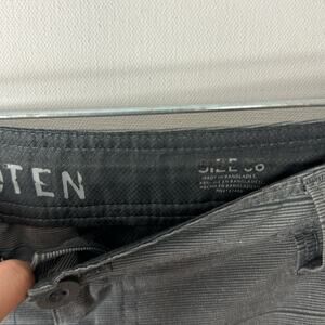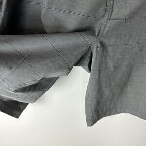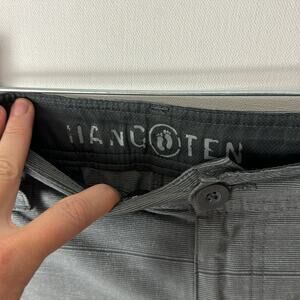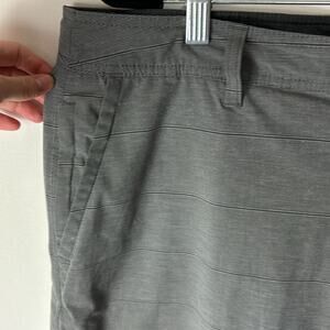 Gently Used Hang Ten Shorts. These are a men's 36. Two tone grey horizontal stripes throughout. Front and back pockets. Very lightweight, fast drying shorts. Could be good for golf or other outdoor activities. Inseam is 10". 67% polyester, 26% cotton, 7% elastane.