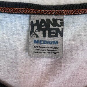 The Hang Ten Tank Top in men's size medium is a casual vacation tee featuring a palm sunset design. Made from a comfortable cotton blend material, this sleeveless t-shirt has a regular fit and a round neckline. Perfect for a laid-back yet stylish look, this top is ideal for days spent relaxing or enjoying outdoor activities.