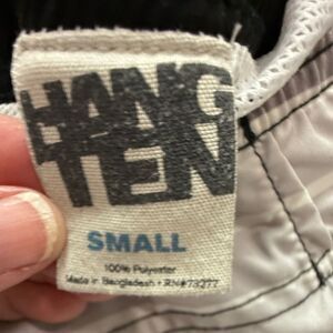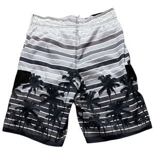 Hang Ten Black & Gray striped Palm Tree Swim Trunks, Has a small stain on front, I did not try to spot treat so possible it could come out, See photo, Size small (I)