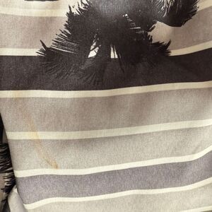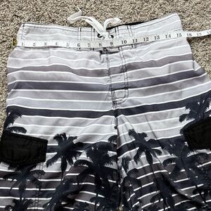 Hang Ten Black & Gray striped Palm Tree Swim Trunks, Has a small stain on front, I did not try to spot treat so possible it could come out, See photo, Size small (I)