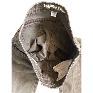 Brown skinny jeans with a faded finish and tonal stitching. Features classic five-pocket styling with stitched back pockets and belt loops. Made from 99% cotton and 1% spandex for slight stretch.