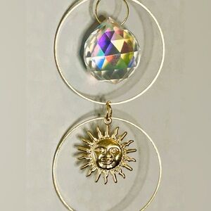 Prism Suncatcher reflects the rainbows from the sun when the sunlight hits. Made of Moon Sun Metal Form Frame and quality Crystal Balls with hooks, the Crystals are colored. With Suncatchers reflecting Sunlight, bright rainbows are everywhere. Crystals are still beautiful even when there is no light. Dancing in a breeze on a sunny day, the Suncatcher Crystal will cast lovely little rainbows over the ceiling, walls and floor. Hand them to your windows, let the rainbows spread all over the room. Brighten up your house and put sparkling beauty in your life.