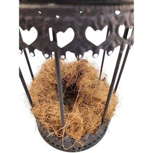 A decorative metal bird cage-style planter featuring intricate heart-shaped cutouts and a natural coco liner, ideal for small plants or creative displays. You can remove the top by undoing the bolt. That way you can plant and decorate inside with ease.