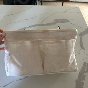 Versatile hanging storage organizer with multiple pockets. Ideal for organizing books, magazines, and accessories. Features a neutral cream color.