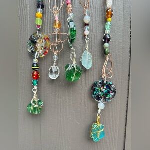 Unique one of a kind - Bits and bobs, sun catcher with loads of charm and handmade elements; small wire sculptures, resin disk, quartz, serpentine, glass beads, sea glass, an crystal beads and more.