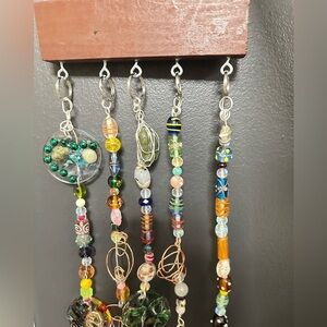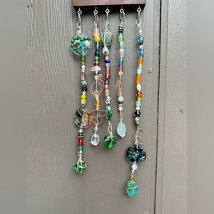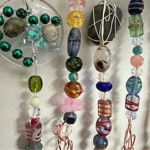This one of a kind SUN CATCHER has my handmade resin signature pieces, a round disc located near the bottom of the sun catcher on all 3 of the beaded lanyards.