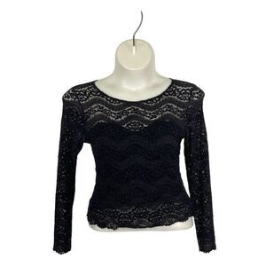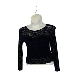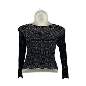 This stretchy black top has a scoop neck and long sleeves. Sheer/see through with the exception of the front, which has a black lining with sweetheart neckline. Wear it as a layering piece, or be bold and wear it solo.