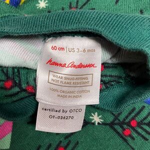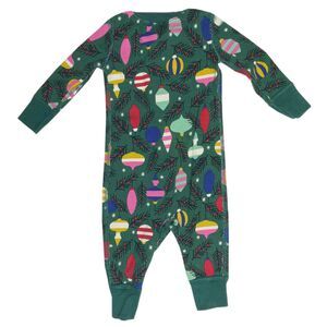 Hanna Andersson Baby Zip Sleeper Size 3-6 Months Delightful Decorations Cotton. Sleeper is in good preowned condition, with minor wash wear. 100% organic cotton. Colorful Christmas ornament print on green background. Zipper closure, with tab and snap at neckline.