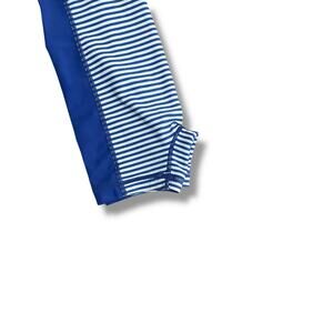 Adorable Hanna Andersson long-sleeve one-piece rash guard swimsuit in a classic blue & white stripe pattern with solid blue contrast sides. Made with Hanna’s signature UPF 50+ sun-protective fabric, this suit provides excellent coverage and comfort for beach days, pool days, and all summer activities. Features a front zip closure for easy dressing, raglan sleeves for mobility, and a fully lined crotch area for comfort. Made from a soft, stretchy nylon-spandex blend that dries quickly and holds its shape well.