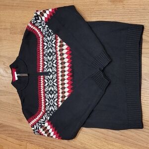 Hanna Andersson boys' black, red and cream fair isle sweater. Half zip, Mock turtleneck, 100% organic cotton. Very gently used, EUC (excellent condition). Size 150 is equivalent to a US 12. Size chart says fits 52-68 inches height, and 75-95 lbs.