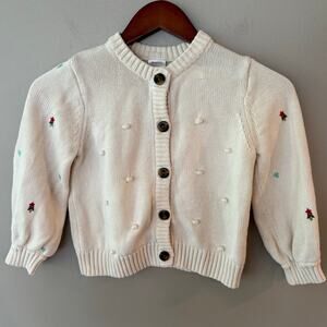 Description: Adorable cream-colored knit cardigan with bobble texture on the front and delicate floral embroidery on the sleeves; the print is a subtle holiday theme though it could be used year round; tortoiseshell-style buttons; crew neckline. Soft and cozy mid-weight knit