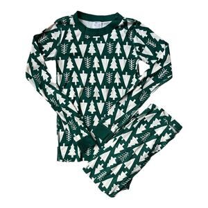 Hanna Andersson Fall/Winter Long John Pajama Set. Green Background with Ivory Trees. 100% Organic Cotton. Youth Size 150 / US 12.