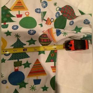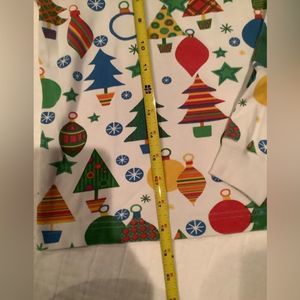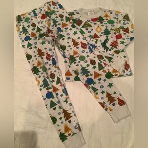 Cozy pajama set with festive holiday print. Features trees, ornaments, and snowflakes. Perfect for bedtime fun.