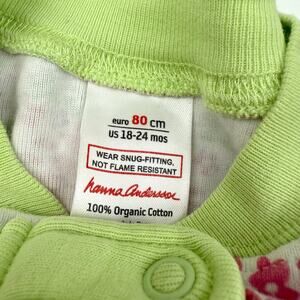 Hanna Andersson Floral Print Organic Sleeper Pajamas. White with green trim and pink flowers. Size 80 or 18/24m. Play, some food stains, I haven’t treated.