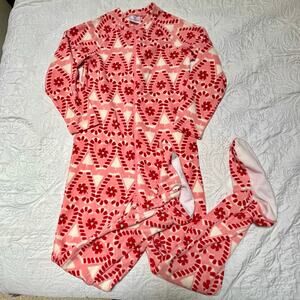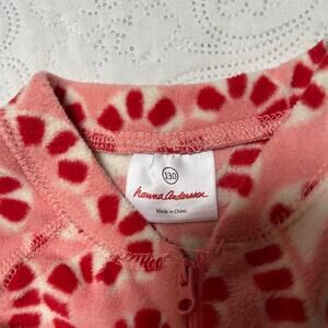 Hanna Andersson one piece footed union suit romper fleece pajamas in pink candy cane print. Very good condition, light wear. Size 130 / 8.