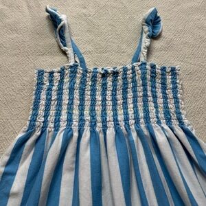Girl Blue White Striped Smocked Flutter Cotton Dress from Hanna Andersson.