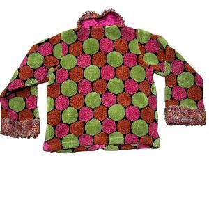 Good preowned condition, has been worn, lots of life left. Bright colors: Orange, acid green, pink. Full zipper, no hood. Front patch pockets. Girls 130/Size 8. No holes or stains. 49% acrylic, 42% polyester, 9% wool. Large polka dots against a black background, fuzzy/furry cuffs and collar.