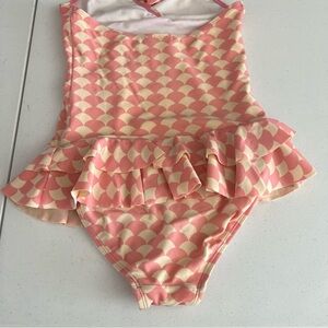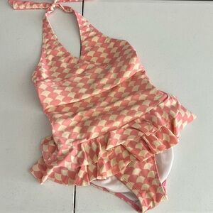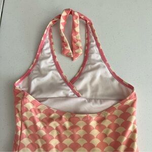Adorable kids halter swimsuit featuring a playful pink and cream pattern. Perfect for fun days at the pool or beach.