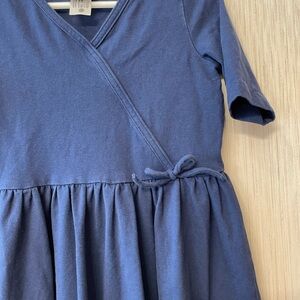 Adorable and comfortable Hanna Andersson girls dress in a rich navy blue color. Features a wrap-style bodice with a cute bow detail at the waist and short sleeves. Made from soft, high-quality cotton that’s perfect for everyday wear or special occasions.