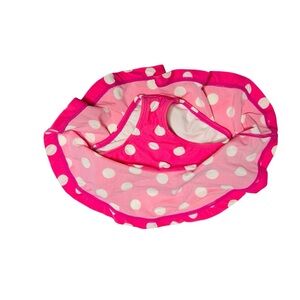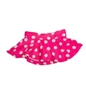 Adorable Hanna Andersson two-piece swimsuit set in size 90 (approx. 2T–3T). Features a vibrant pink background with playful white polka dots. Includes a tank-style top with double straps and a coordinating swim skirt bottom with built-in briefs for comfort and coverage. Perfect for summer fun at the pool or beach!