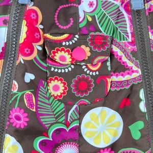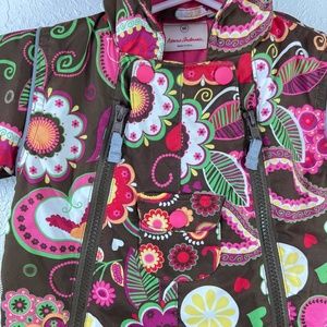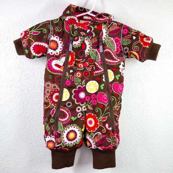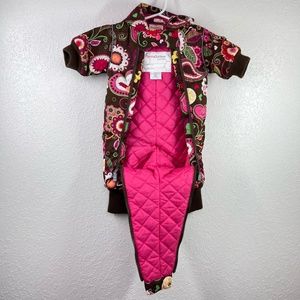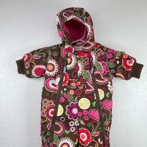 Bundle up your little bundle of joy in this super cute AND cozy snow-suit by Hanna Andersson. Hide tiny treasures in the accent pockets. This suit has zippers that extend from neck to ankle down both legs for that easy in and out access. Make your life easier while keeping your precious cargo toasty, warm and adorable. The body is a dark chocolate brown with bright floral accents and soft fuchsia pink lining the inside. This is a 60cm and 3-6 month garment. She came just in time. Enjoy your season with your new kiddo!