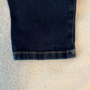 Dark wash, slightly stretchy straight leg jeans with adjustable elastic waist and zipper fly. In excellent used condition - no significant signs of wear.