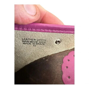 Hanna Andersson leather clogs womens sz 40. Pink floral leather and wood clogs with a 2” heel. Scalloped detail and adjustable leather strap can flip up or down to go around heel. So fun for spring and summer. Great used condition with minor wear on wood. From a smoke free and pet free home.