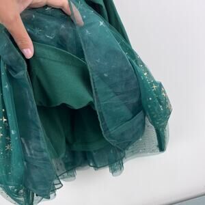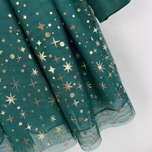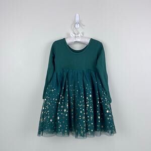 Hanna Andersson Long Sleeve Shimmer Tulle Dress Green. Toddler girl size 90 cm (US 3T). Festive long sleeve, combed cotton jersey dress with multi-layered, shimmery stars tulle skirt. Perfect for a Christmas party! Retail $79. Excellent condition.