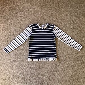 Get your little one ready for summer with this adorable Hanna Andersson swim top! Size 110 cm (kids US size 5), navy and white stripes, long sleeves, and a sweet ruffle. Perfect for the pool, beach, or any water activity!