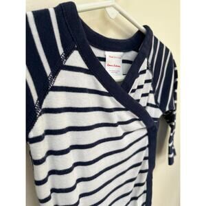Classic side snap onesie from HA. Minor wash wear that is typical for the material. VGUC. No additional flaws to note. Navy and white.