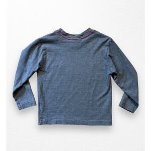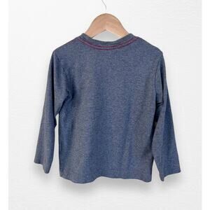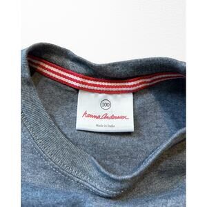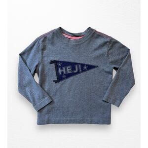 Gray long sleeved shirt from HA in size 100 (US 4). Features red contrast top stitching at shoulders and back collar, and a felt pennant appliqué on the front that reads “HEJ!” (hey).