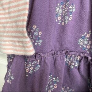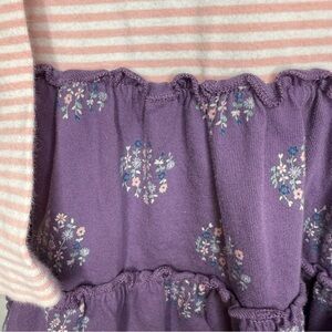 Adorable dress with pink stripes and a tiered purple skirt. Ideal for casual outings.