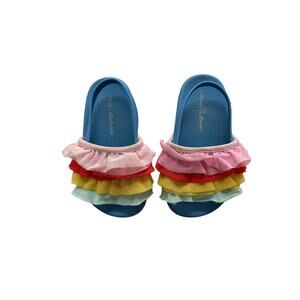Hanna Andersson rainbow ruffle sandals. Listed in play condition for some wear and pink ruffles are a little discolored. My daughter absolutely loved these! No size label, but they are a size 7.