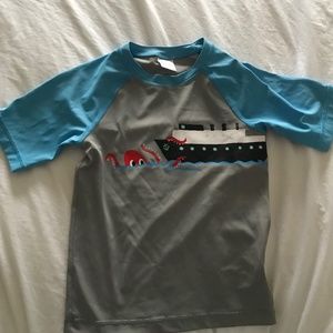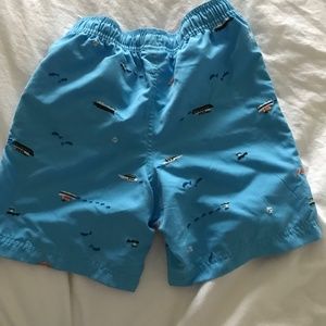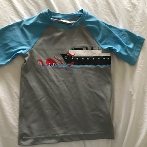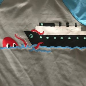 Hanna swim suit set. in a size 120 6-7. The trunks have colorful ships and octopus Embroidery. The tag is removed on the shorts. It looks new aside from wrinkles.