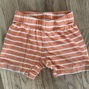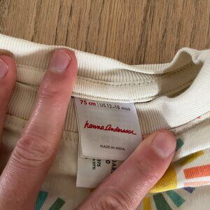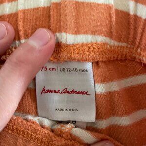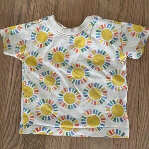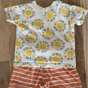 Fun Hanna Andersson set featuring orange shorts with a white stripe and a white t-shirt with a rainbow sunshine print. Size 12-18 months. In very good used condition.