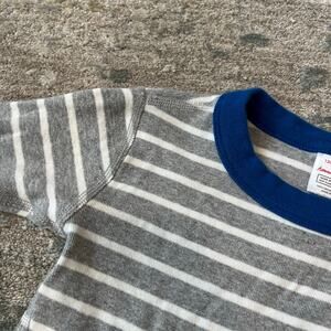 Hanna Andersson Short John Bunny Pajamas. Boy or girl size 120 cm (US 6-7 years). Two piece pajama set. Grey and white stripes with a bunny rabbit face on the belly. Light wear to the graphic and a small spot of loose stitching at the them (see photo).