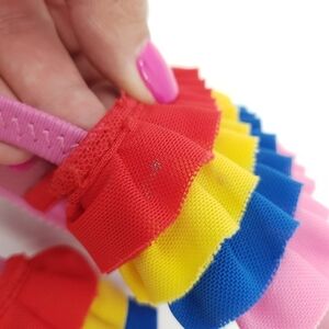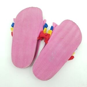 Hanna Andersson Sling Back Ruffle Sandals Pink and Rainbow Kids Size 8.5. Sandals don't have printed size but they measure like a 8.5 (see last photo). One small flaw (stain) on the ruffles of one shoe, seen photographed.