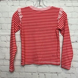 Hanna Andersson pink and red striped long sleeve rashguard top. Bird print across front. Mini pink ruffles at the shoulder hem.