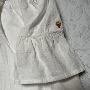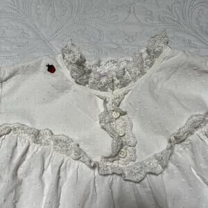 Hanna Andersson Lacy Dress in Swiss Dot. Solid Hanna White tiered dress with bell sleeves, lace details and embroidered design including ladybug. Play condition for marks on front. Size 140 / 10.