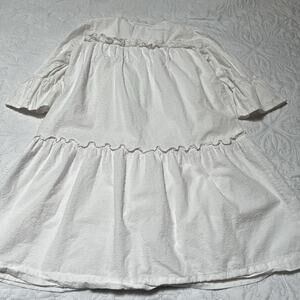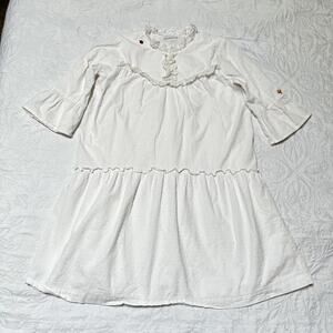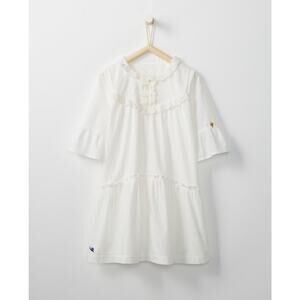 Hanna Andersson Lacy Dress in Swiss Dot. Solid Hanna White tiered dress with bell sleeves, lace details and embroidered design including ladybug. Play condition for marks on front. Size 140 / 10.