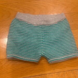 Soft knit shorts with teal and gray stripes. Ideal for playtime.