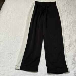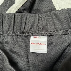 Hanna Andersson track style athletic pants. Black and white with elastic waist band. Play condition for some pulls in mesh fabric, front spot and overall wear, see photos. Size 120 / 6-7.