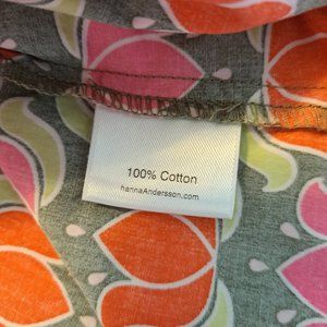 Excellent condition floral dress from Hanna Andersson. Olive green base with pink and red tulip flowers, pink trim along the bottom and pink ties at the shoulders. Size is 130 (equates to a US size 8). Measures about 17 inches between the pits and 25.5 inches long.
