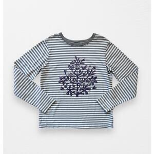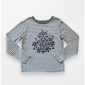 Gray and white striped jersey from HA in size 150 (US 12). Features a metallic lavender wildflowers graphic. Excellent pre-loved condition.