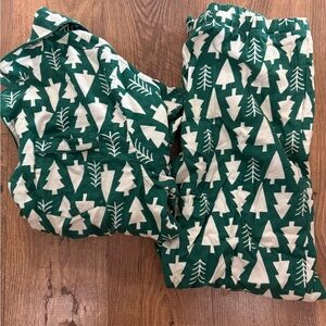 Experience the comfort and style of Hanna Andersson's pajama set, featuring a delightful green and white holiday pattern. Crafted from soft, cozy fabric, these pajamas ensure a restful night's sleep while adding a touch of festive cheer. The classic design with white Christmas trees on a deep green background makes it a perfect choice for the holiday season.
