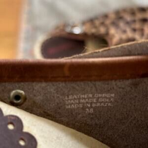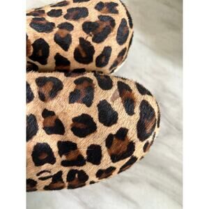 Very good condition, small spot of hair loss on toe, small mark on back of heel, and small amount of leather wear around shoe. Traditional Swedish clog, brown leopard print pony hair upper, wooden sole.